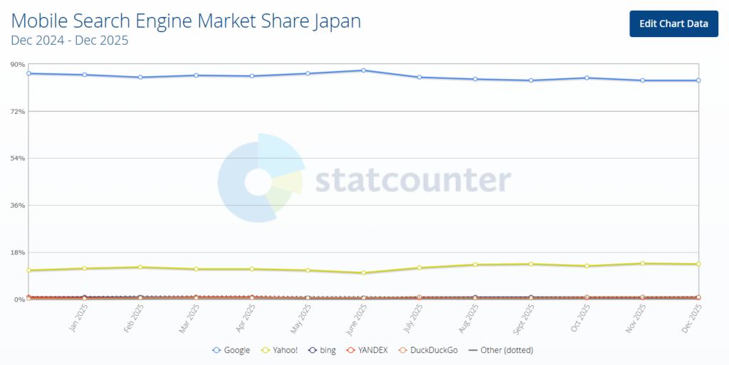2026年1月時点での、日本における検索エンジンのシェア率は以下の通りです。