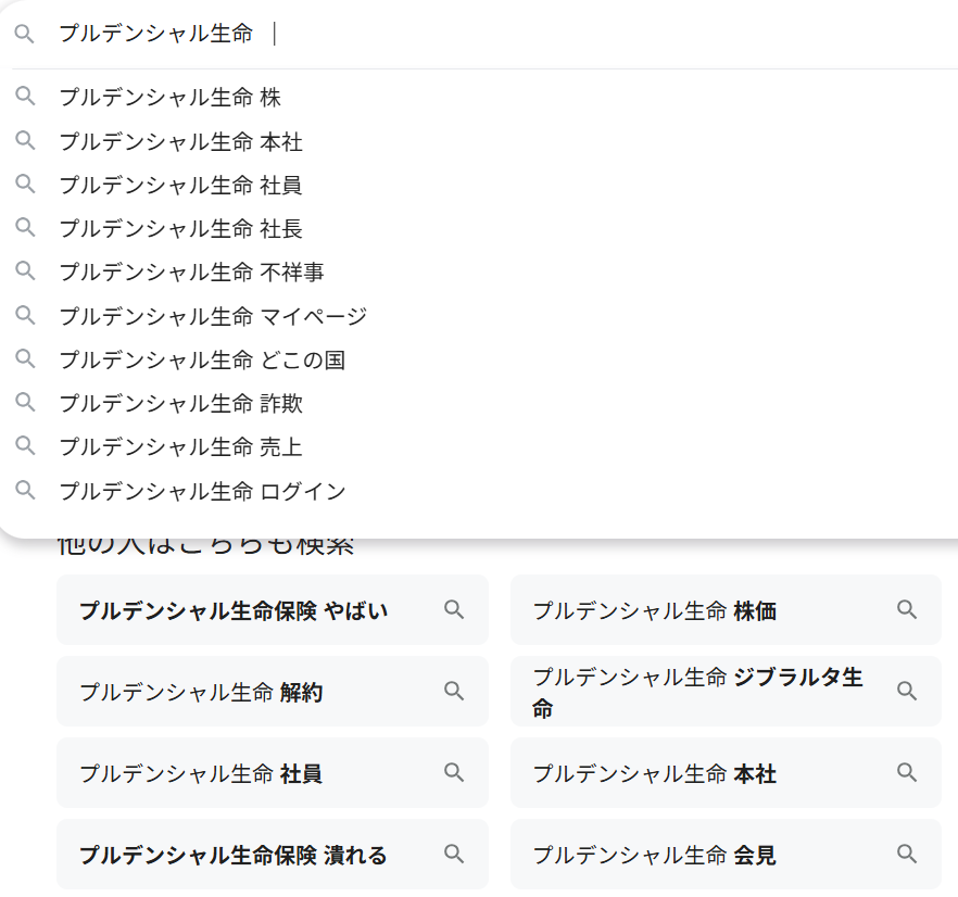 検索数の増加に伴い、人々が「プルデンシャル生命」と一緒に検索しているキーワードが目に付くようになります。